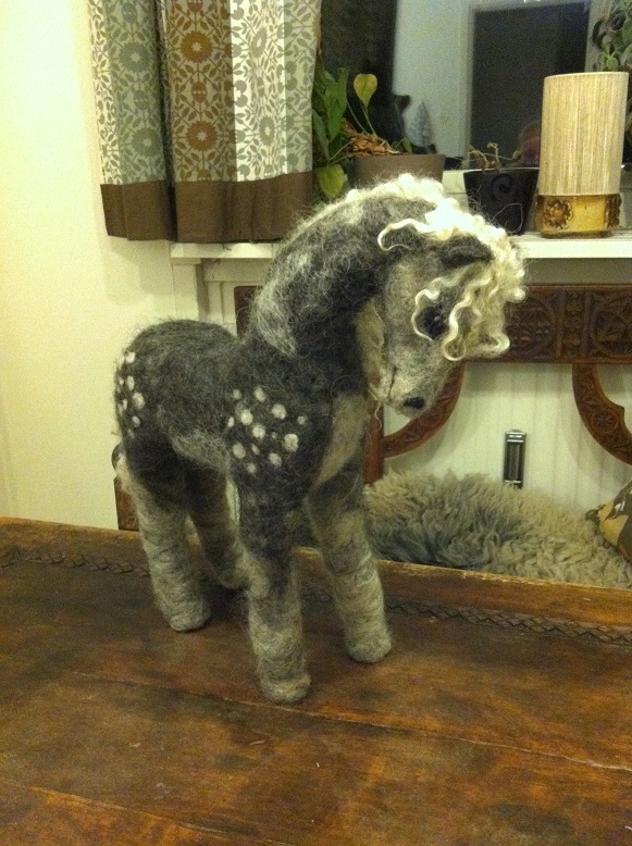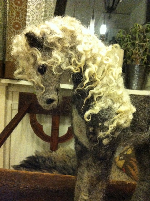 Nåltovad häst i massiv ull. Ca 25 cm hög. Ull från gutefår, gotlandsfår, värmlandsfår samt leicester. Såld.